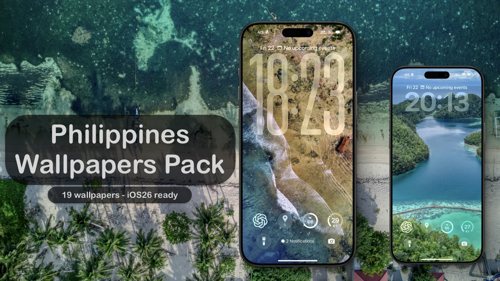This pack features 19 aerial and scenic wallpapers from the Philippines, capturing turquoise waters, tropical cliffs, white sand beaches, and surfers at sunset. Each wallpaper is designed to shine with iOS 26’s new LiquidGlass UI.